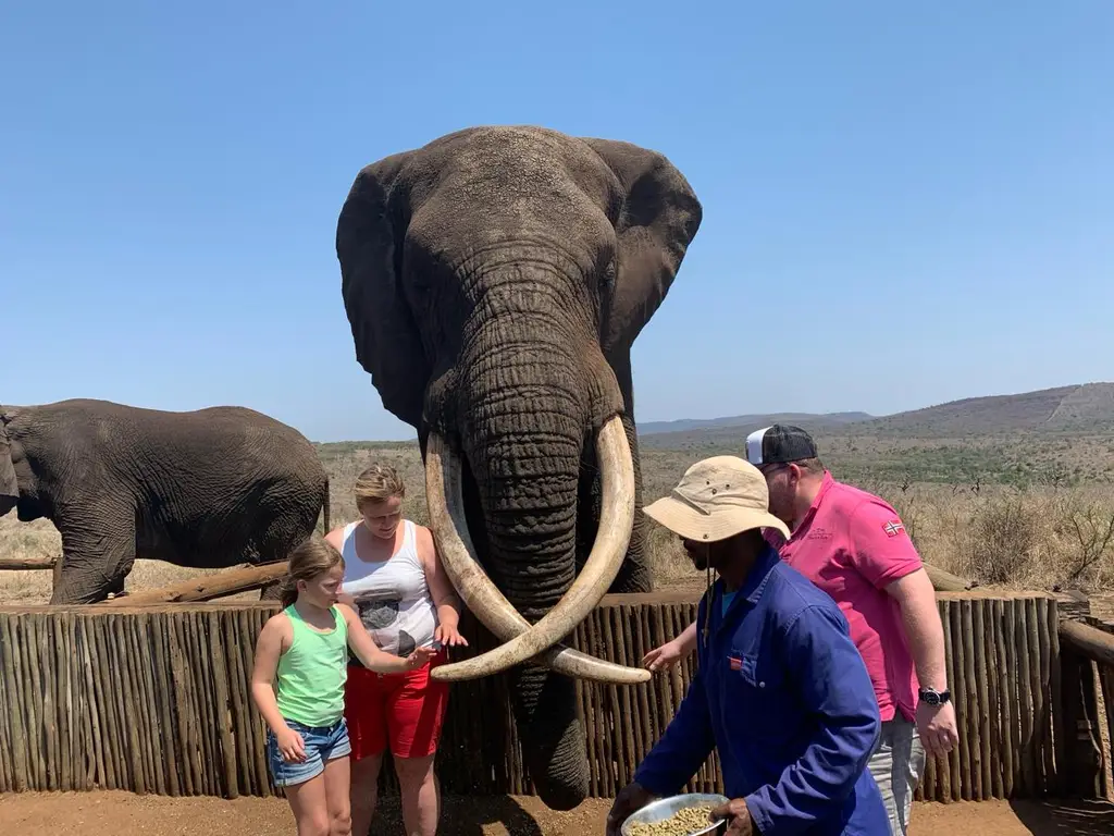 One may wonder why the elephants are part of the reserve in Zululand and not roaming their natural land. Rambo and Rachel belonged to a breeding herd in Zimbabwe that required culling. Fortunately, both elephants succeeded in escaping and were successfully moved to this safe-haven. One of the local knowledgeable rangers will talk you through Rambo and Rachel’s history and provide you with interesting facts about elephants. Tourists are given the rare chance to touch Rambo’s and Rachel’s tusks, ears, legs and tongue whilst feeding them. The Elephants enjoy human interaction due to their unfortunate history. The Elephants are there by their own will which is amazing and surprising. Tourists absolutely love the unique experience.