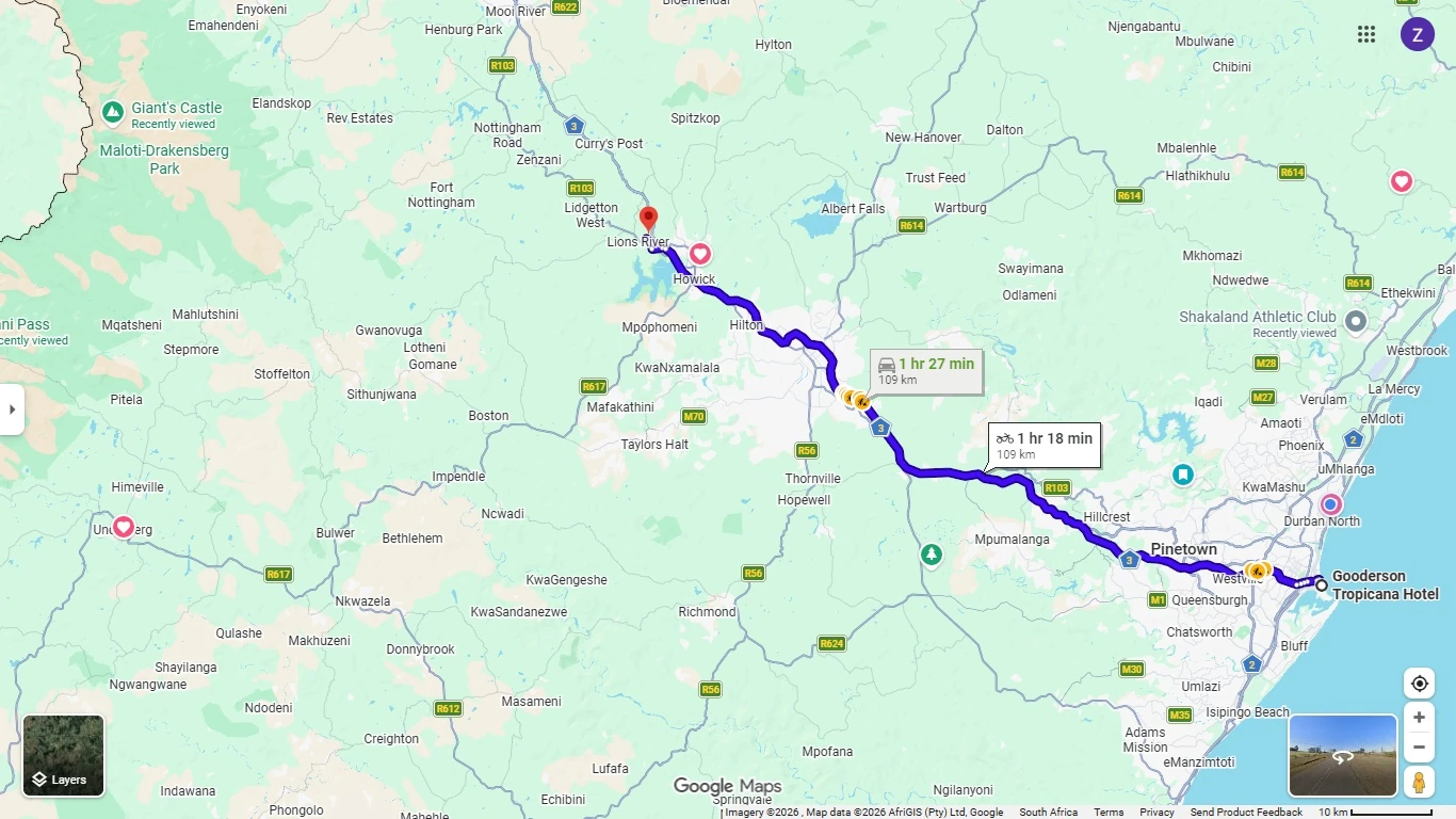 - Pickup & drop off service with in a 5km radius of our meeting point at Gooderson Tropicana Hotel, 85 OR Tambo Parade, Durban. If you are out of our pickup radius, special arrangements can be made to pick you up at your location of choice